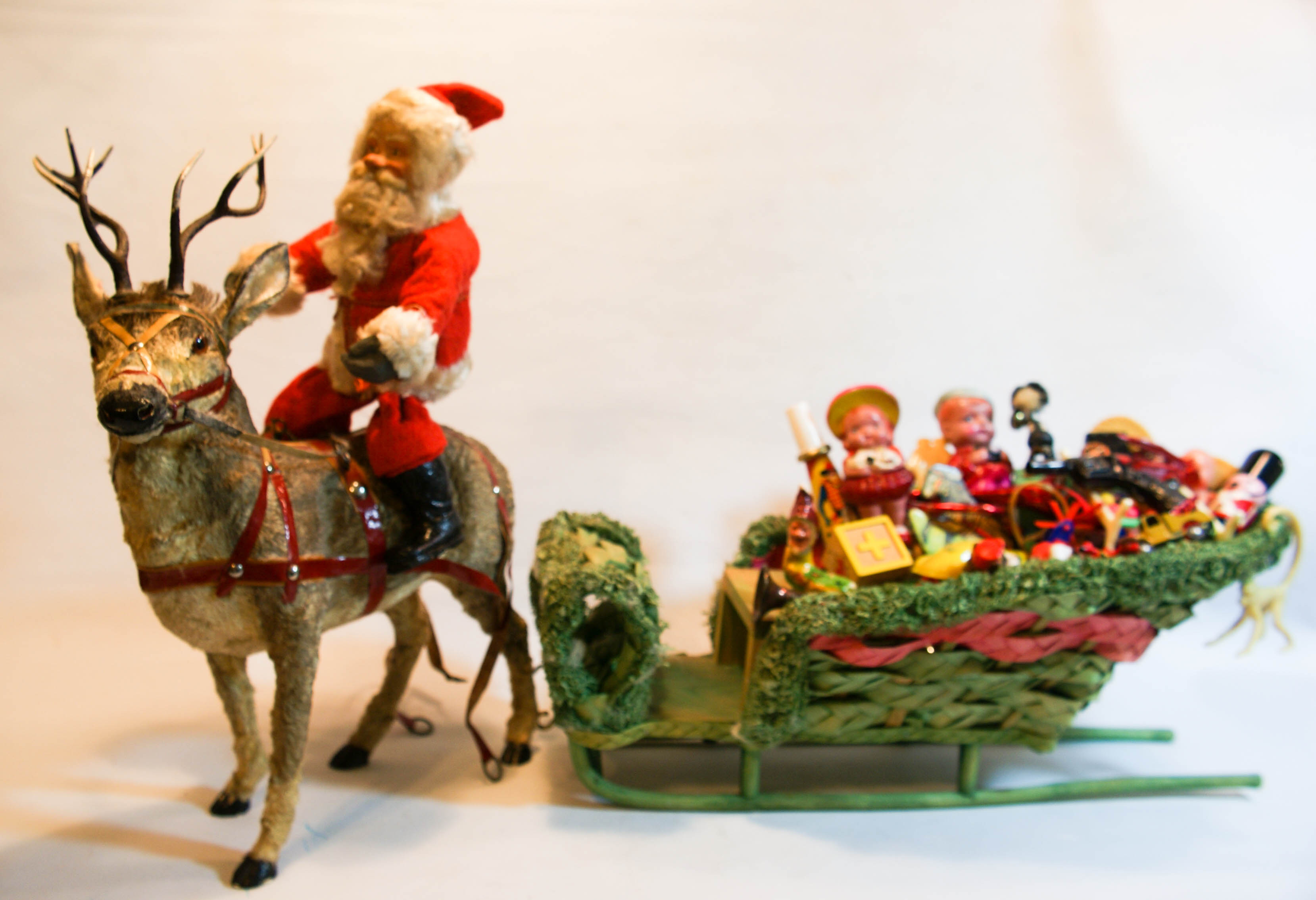 Super rare (cir.) 1910 Santa Claus store display. It is made in Germany, measures over 24″ long and 16″ tall. The sleigh is filled with vintage toys from 1920 and 1930’s. It is very hard piece to find. The detail work on this piece is stunning. Germans were top of the international market for quality early toys dolls.