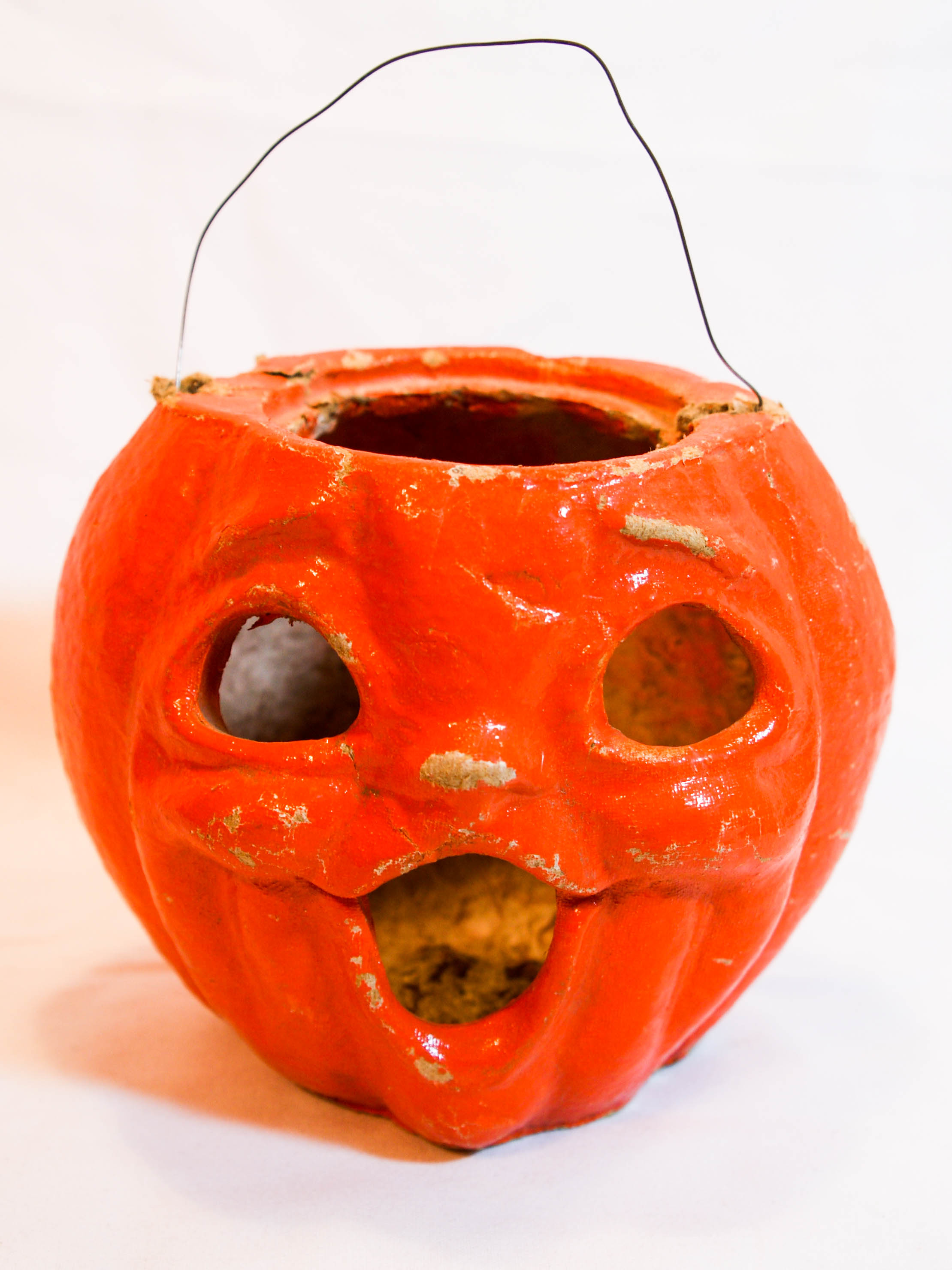 The symbol that captures the Halloween spirit is the jack-o’-lantern, or carved pumpkin. Some of the earliest jack-o’-lanterns were made in Germany of composition or pressed paper. This one is in great shape. There are plenty of collectors around the world for holiday and Halloween items.