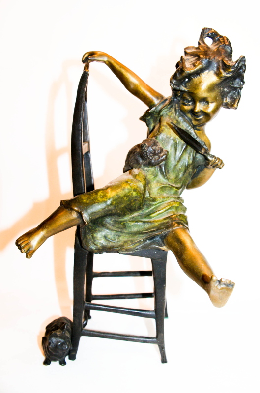 1900 ORIGINAL ART BRONZE JUAN CLARA GIRL ON CHAIR FEATHER KITTENS