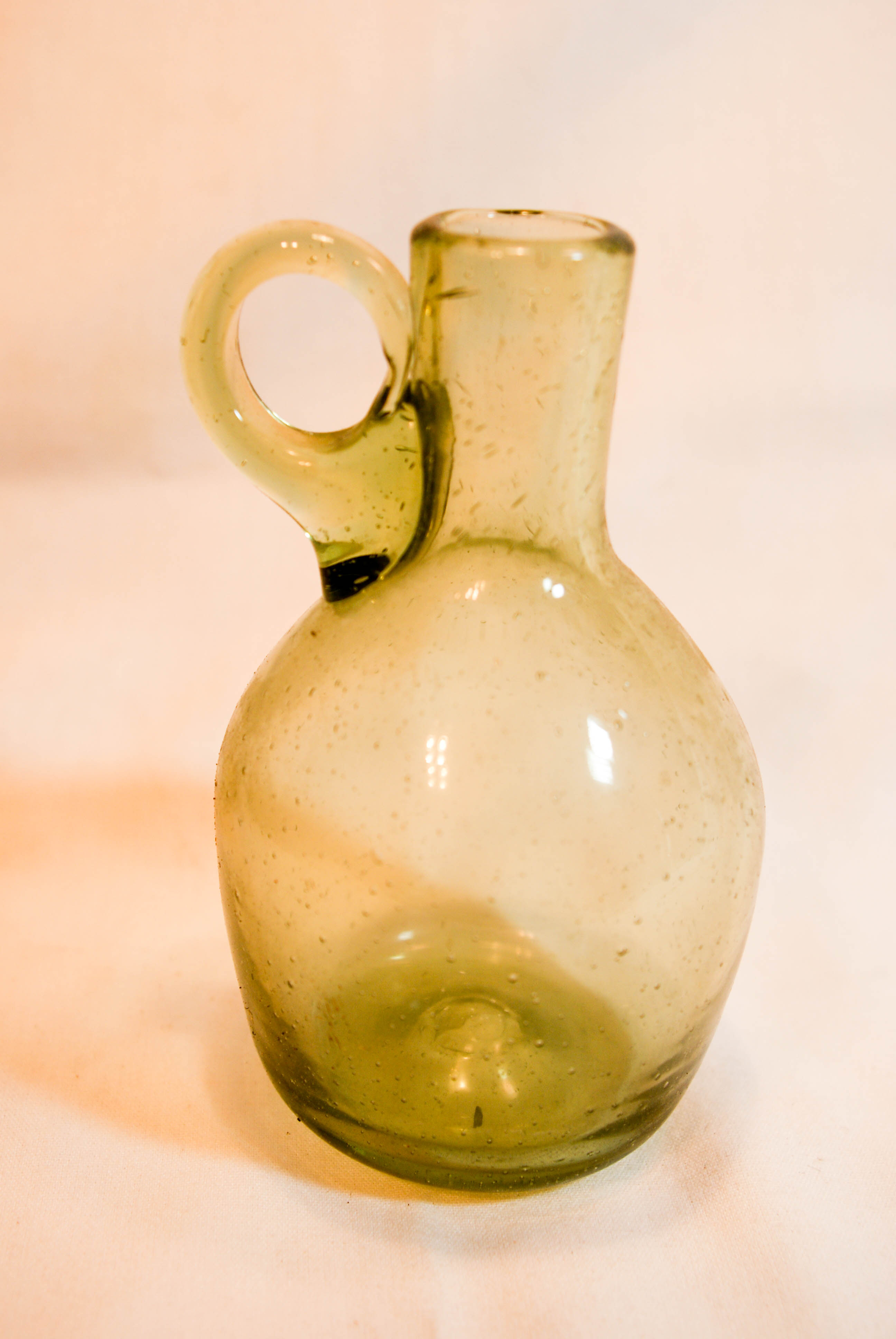 This stunning green glass jug was handmade blown in early 1800’s was made to hold wine or whiskey. The translucent green glass dates to late first or second century AD to Mid AD. There is not much difference on how they were blown and made back then to now. It is an art and craft in hand blowing glass.