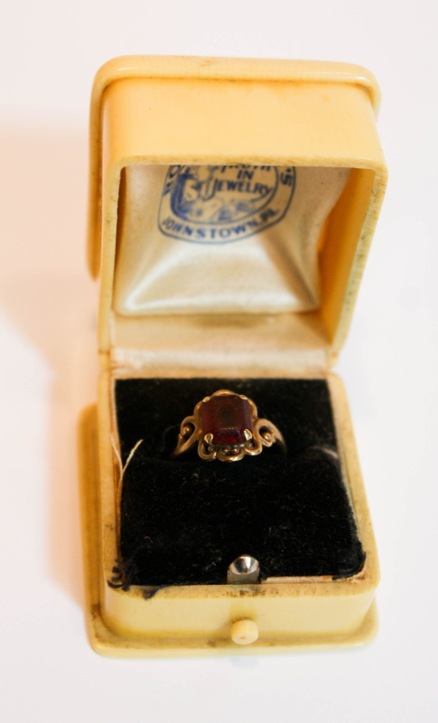 1900 Victorian 10kt gold ruby ring with original celluloid box. Victorian era jewelry was elegant and romancing with lots of emotion. The elegance of royalty was the design of emulation of the Queens and wealthy. There was very fine jewelry and mid-level costume. All was hand crafted and was art form at its best.