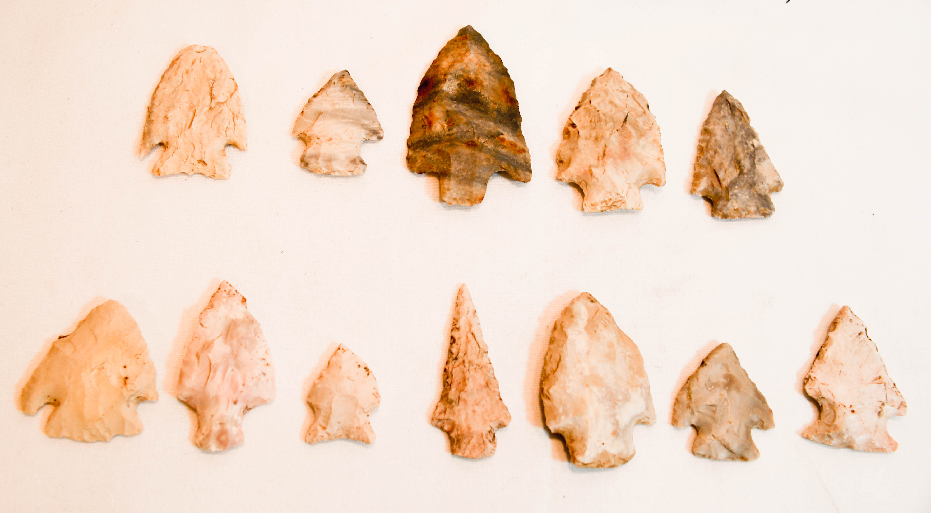 lot of Ancient Indian made arrow heads. These were all from Nigangua MO. Osage Fork of the Gaseonade River . They are 1 1/4″ to almost 3″ This came from estate of professor of archeology and history. He was collecting for over 70 plus years. In the Stone Age, people used sharpened bone, flint napped stones, flakes, and chips of rock as weapons and tools. Such items remained in use throughout human civilization, with new materials used as time passed. As archaeological artifacts such objects are classed as projectile points (arrow Heads), without specifying whether they were projected by a bow or by some other means such as throwing since the specific means of projection.