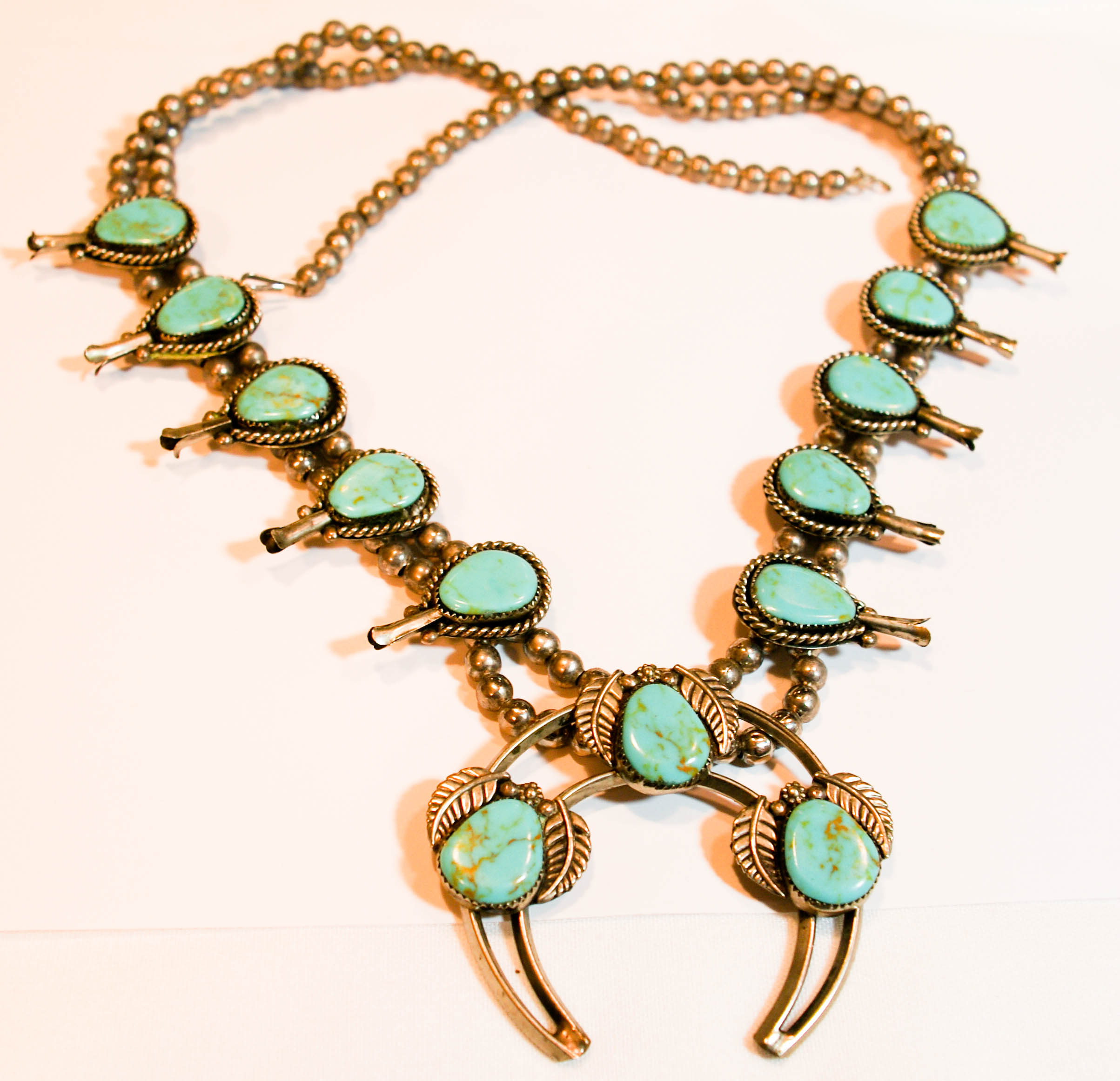 This beautiful hand crafted 1940’s sterling turquoise Native American made Navajo Indian made 26” necklace. Most jewelry made was masterfully made and skills past down through generations. One of the most important forms of Navajo and Southwestern Native American jewelry, is the Squash Blossom Necklace. Most are made of a string of plain round silver beads, interspersed with more stylized “squash blossoms”, and feature a pendant, or “naja”, hung from the center of the strand. The squash blossom beads are copied from the buttons which held together the pants worn by the Spanish, and later, Mexican caballeros. These buttons represent – and are modeled after – pomegranates